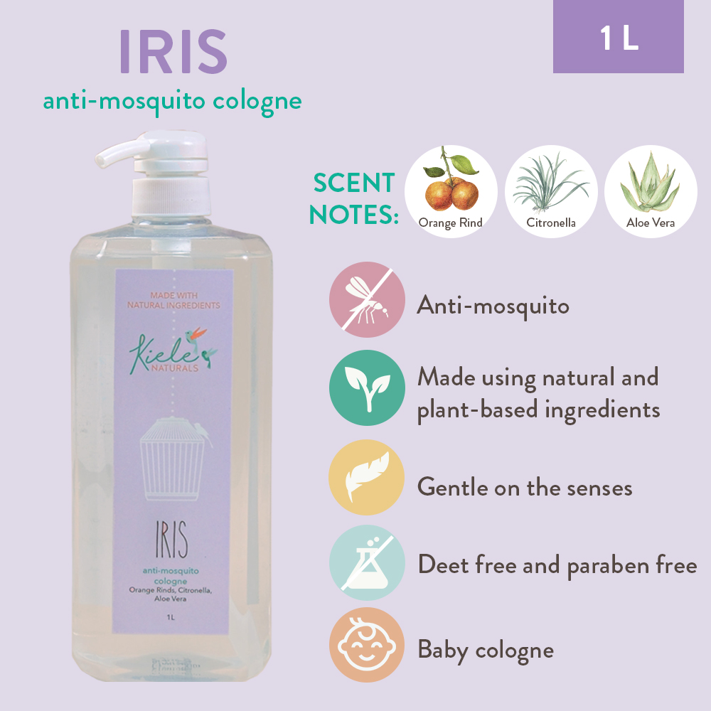 1 Liter refill of Iris Anti-Mosquito Baby Cologne perfect for transferring to smaller vials or just refilling your anti-mosquito bottles!